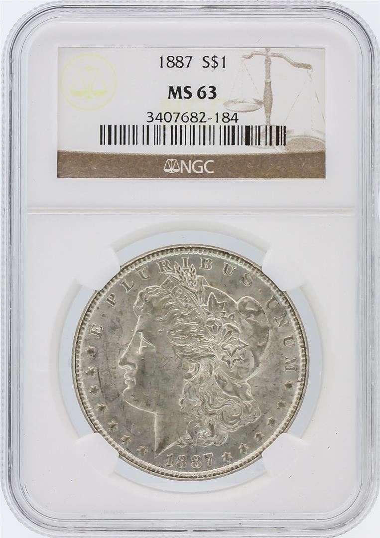One 1887 NGC MS63 Morgan Silver Dollar.