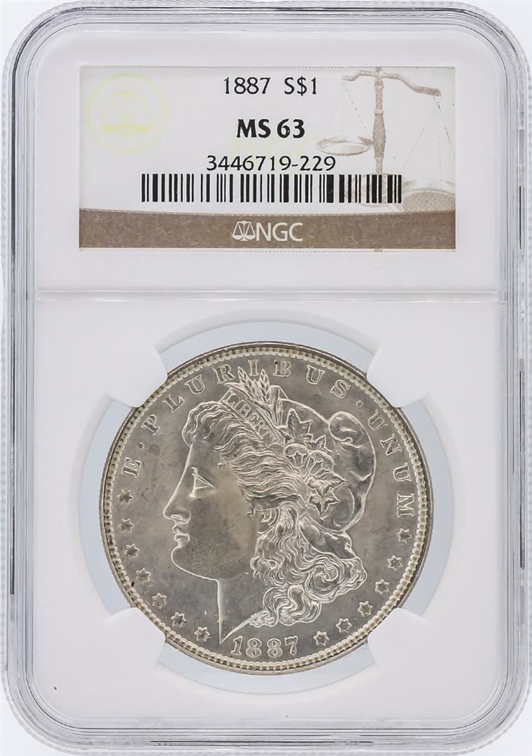 One 1887 NGC MS63 Morgan Silver Dollar.