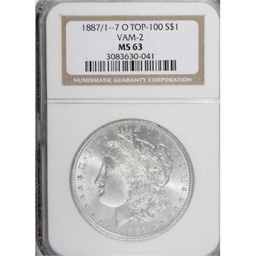 <B>1887/1--7 O $1 MS63 NGC.</B></I> VAM-2. Top 100. Census: (3470/1717). PCGS Population (2711/2296). Mintage: 11,550,000. Numismedia Wsl. Price for NGC/PCGS coin in MS63: $94. (#7176)<BR><BR><B>Coin Engraver:</B> George T. Morgan<BR><BR><b>Shipping:</b> Coins & Currency (<a target="_blank" href="http://www.heritageauctions.com/common/shipping.php">view shipping information</a>)