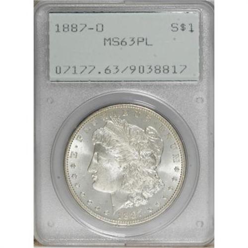 <B>1887-O $1 MS63 Prooflike PCGS.</B></I> PCGS Population (100/102). NGC Census: (84/80). Numismedia Wsl. Price for NGC/PCGS coin in MS63: $180. (#7177)<BR><BR><b>Shipping:</b> Coins & Currency (<a target="_blank" href="http://www.heritageauctions.com/common/shipping.php">view shipping information</a>)