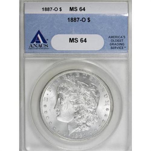 <B>1887-O $1 MS64 ANACS.</B></I> NGC Census: (1599/103). PCGS Population (1983/276). Mintage: 11,550,000. Numismedia Wsl. Price for NGC/PCGS coin in MS64: $340. (#7176)<BR><BR><B>Coin Engraver:</B> George T. Morgan<BR><BR><b>Shipping:</b> Coins & Currency (<a target="_blank" href="http://www.heritageauctions.com/common/shipping.php">view shipping information</a>)