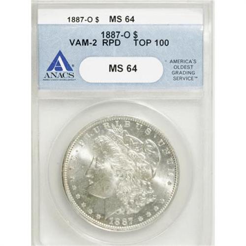 <B>1887-O $1 MS64 ANACS.</B></I> VAM-2. RPD. A Top 100 variety. NGC Census: (1600/103). PCGS Population (1993/275). Mintage: 11,550,000. Numismedia Wsl. Price for NGC/PCGS coin in MS64: $340. (#7176)<BR><BR><B>Coin Engraver:</B> George T. Morgan<BR><BR><b>Shipping:</b> Coins & Currency (<a target="_blank" href="http://www.heritageauctions.com/common/shipping.php">view shipping information</a>)