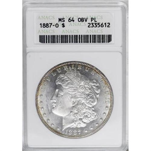 <B>1887-O $1 MS64 Obverse Prooflike ANACS.</B></I> NGC Census: (1600/103). PCGS Population (1993/275). Mintage: 11,550,000. Numismedia Wsl. Price for NGC/PCGS coin in MS64: $340. (#7176)<BR><BR><B>Coin Engraver:</B> George T. Morgan<BR><BR><b>Shipping:</b> Coins & Currency (<a target="_blank" href="http://www.heritageauctions.com/common/shipping.php">view shipping information</a>)