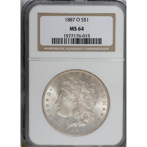 <B>1887-O $1 MS64 NGC.</B></I> NGC Census: (1582/103). PCGS Population (1958/270). Mintage: 11,550,000. Numismedia Wsl. Price for NGC/PCGS coin in MS64: $340. (#7176)<BR><BR><B>Coin Engraver:</B> George T. Morgan<BR><BR><b>Shipping:</b> Coins & Currency (<a target="_blank" href="http://www.heritageauctions.com/common/shipping.php">view shipping information</a>)