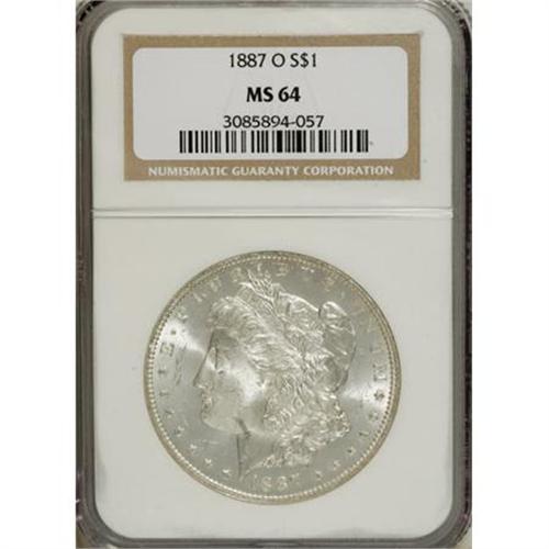 <B>1887-O $1 MS64 NGC.</B></I> NGC Census: (1582/103). PCGS Population (1958/270). Mintage: 11,550,000. Numismedia Wsl. Price for NGC/PCGS coin in MS64: $340. (#7176)<BR><BR><B>Coin Engraver:</B> George T. Morgan<BR><BR><b>Shipping:</b> Coins & Currency (<a target="_blank" href="http://www.heritageauctions.com/common/shipping.php">view shipping information</a>)