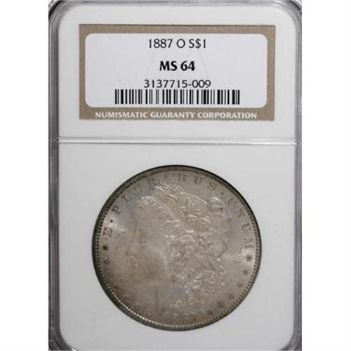 <B>1887-O $1 MS64 NGC.</B></I> NGC Census: (1620/103). PCGS Population (2048/281). Mintage: 11,550,000. Numismedia Wsl. Price for NGC/PCGS coin in MS64: $330. (#7176)<BR><BR><B>Coin Engraver:</B> George T. Morgan<BR><BR><b>Shipping:</b> Coins & Currency (<a target="_blank" href="http://www.heritageauctions.com/common/shipping.php">view shipping information</a>)
