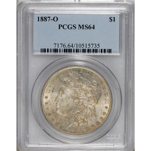 <B>1887-O $1 MS64 PCGS.</B></I> PCGS Population (1909/263). NGC Census: (1544/102). Mintage: 11,550,000. Numismedia Wsl. Price for NGC/PCGS coin in MS64: $324. (#7176)<BR><BR><b>Shipping:</b> Coins & Currency (<a target="_blank" href="http://www.heritageauctions.com/common/shipping.php">view shipping information</a>)