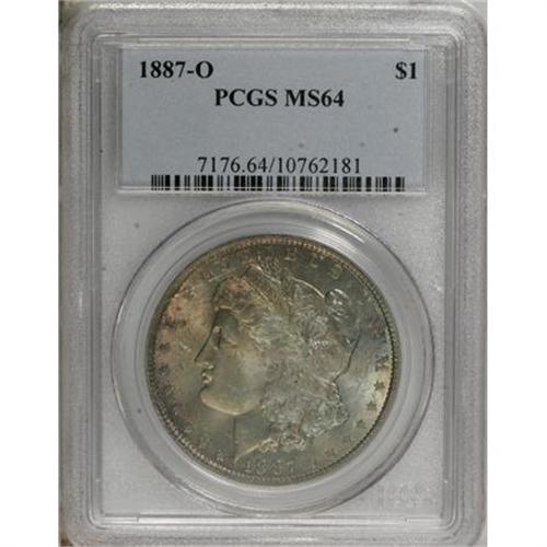<B>1887-O $1 MS64 PCGS.</B></I> PCGS Population (1914/263). NGC Census: (1557/103). Mintage: 11,550,000. Numismedia Wsl. Price for NGC/PCGS coin in MS64: $340. (#7176)<BR><BR><b>Shipping:</b> Coins & Currency (<a target="_blank" href="http://www.heritageauctions.com/common/shipping.php">view shipping information</a>)