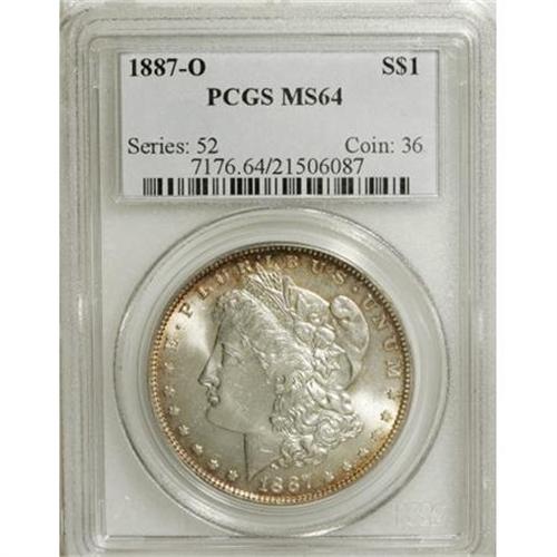 <B>1887-O $1 MS64 PCGS.</B></I> PCGS Population (1914/263). NGC Census: (1554/103). Mintage: 11,550,000. Numismedia Wsl. Price for NGC/PCGS coin in MS64: $340. (#7176)<BR><BR><b>Shipping:</b> Coins & Currency (<a target="_blank" href="http://www.heritageauctions.com/common/shipping.php">view shipping information</a>)