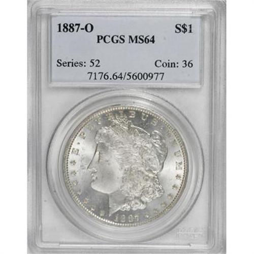 <B>1887-O $1 MS64 PCGS.</B></I> PCGS Population (1942/267). NGC Census: (1582/103). Mintage: 11,550,000. Numismedia Wsl. Price for NGC/PCGS coin in MS64: $340. (#7176)<BR><BR><B>Coin Engraver:</B> George T. Morgan<BR><BR><b>Shipping:</b> Coins & Currency (<a target="_blank" href="http://www.heritageauctions.com/common/shipping.php">view shipping information</a>)