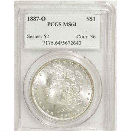 <B>1887-O $1 MS64 PCGS.</B></I> PCGS Population (1969/273). NGC Census: (1582/103). Mintage: 11,550,000. Numismedia Wsl. Price for NGC/PCGS coin in MS64: $340. (#7176)<BR><BR><B>Coin Engraver:</B> George T. Morgan<BR><BR><b>Shipping:</b> Coins & Currency (<a target="_blank" href="http://www.heritageauctions.com/common/shipping.php">view shipping information</a>)