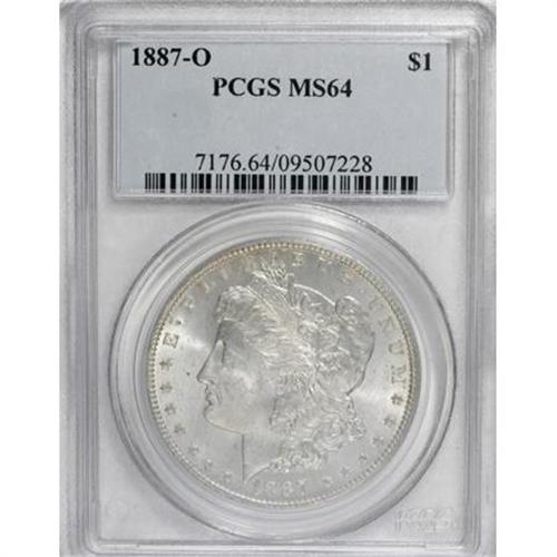 <B>1887-O $1 MS64 PCGS.</B></I> . PCGS Population (2019/277). NGC Census: (1614/103). Mintage: 11,550,000. Numismedia Wsl. Price for NGC/PCGS coin in MS64: $330. (#7176)<BR><BR><B>Coin Engraver:</B> George T. Morgan<BR><BR><b>Shipping:</b> Coins & Currency (<a target="_blank" href="http://www.heritageauctions.com/common/shipping.php">view shipping information</a>)