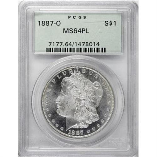 <B>1887-O $1 MS64 Prooflike PCGS.</B></I> Housed in an older green-label holder, this splendid prooflike piece has full mint brilliance. The fields are deep mirrors that frame the lustrous devices, creating a modest cameo appearance. PCGS has only certified 14 finer prooflike examples (1/08).<BR><BR><B>Coin Engraver:</B> George T. Morgan<BR><BR><b>Shipping:</b> Coins & Currency (<a target="_blank" href="http://www.heritageauctions.com/common/shipping.php">view shipping information</a>)