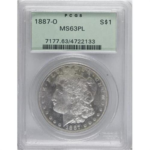 <B>1887-O $1 MS63 Prooflike PCGS.</B></I> PCGS Population (100/102). NGC Census: (84/80). Numismedia Wsl. Price for NGC/PCGS coin in MS63: $180. (#7177)<BR><I>From The Diamond Head Collection.</B></I><BR><BR><B>Coin Engraver:</B> George T. Morgan<BR><BR><b>Shipping:</b> Coins & Currency (<a target="_blank" href="http://www.heritageauctions.com/common/shipping.php">view shipping information</a>\)