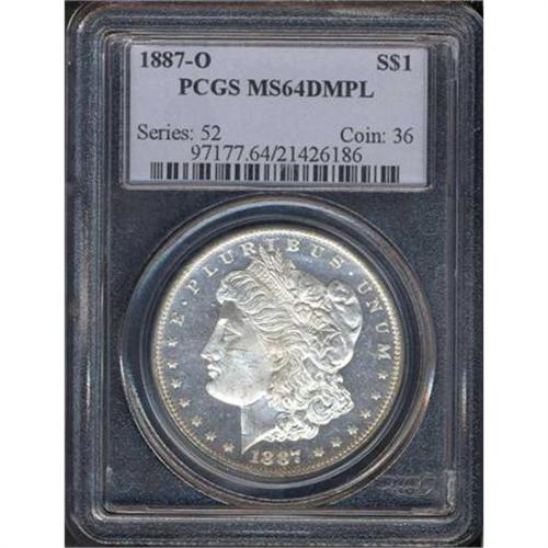 <b>1887-O Morgan Dollar. PCGS graded MS64 DMPL.</b> Very carefully made and preserved, as one would expect from the grade; however, what really sets this coin apart from others is its intense cartwheel mirrors whose "watery" effect rolls around each side. The major devices are snow white with frost. Here, too, we are struck by the nice, convincing design detail for all areas of this important O-mint coin with not even the slightest amount of flatness on the centers. Watch the price action when bidding commences <b>(PCGS # 97177)</b>