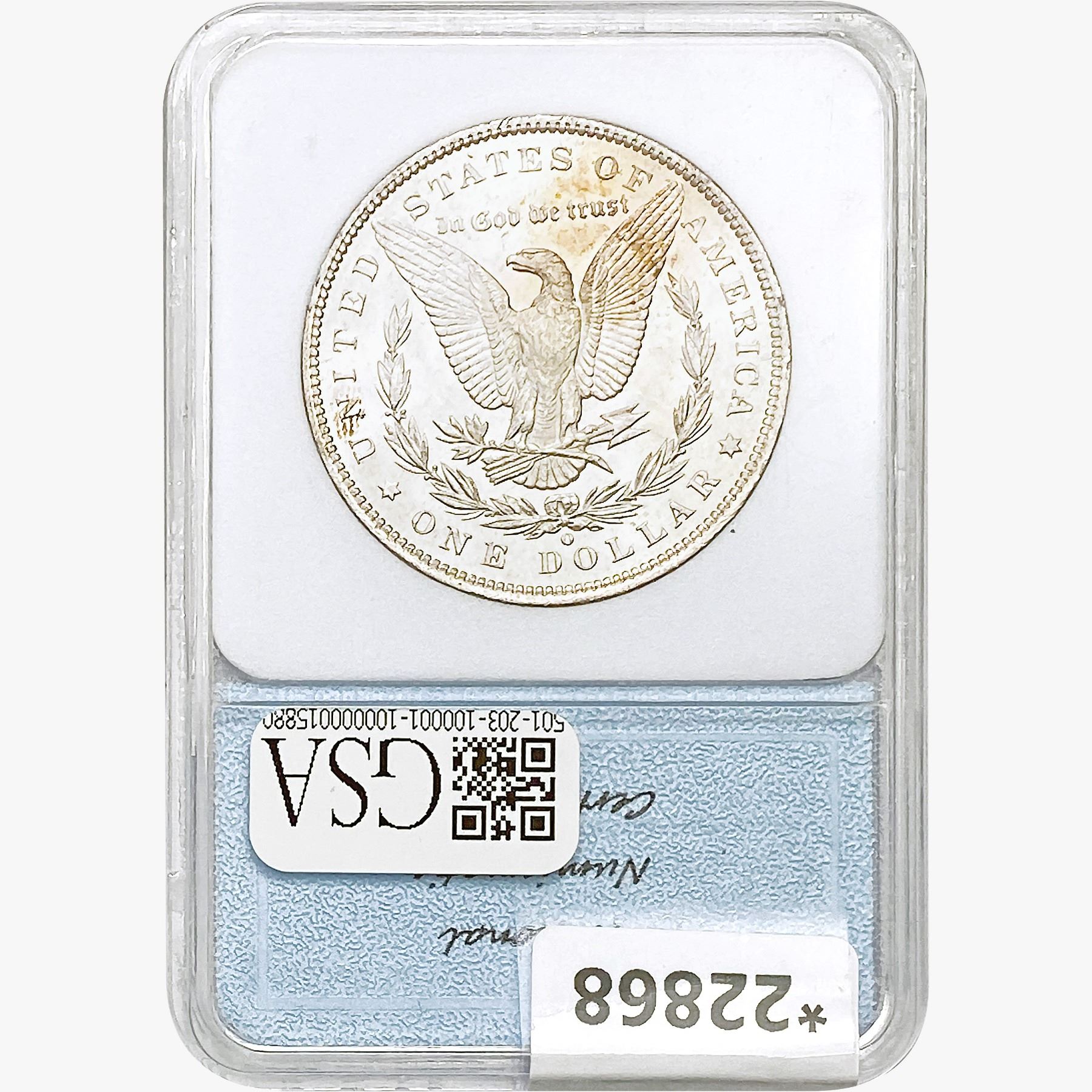 COINS AND CURRENCY LISTED IN GSA’S CATALOG AS GRADED AND ENCAPSULATED BY PCGS, NGC, ANACS, ICG, PCGS CURRENCY, PMG, PCGS BANKNOTE GRADING, CMC OR ANY OTHER THIRD-PARTY GRADING SERVICE ARE LIKEWISE SOLD “AS-IS” EXCEPT AS EXPRESSLY SET FORTH HEREIN. ALL THIRD-PARTY GRADING SERVICE GUARANTEES, INCLUDING AUTHENTICITY, ARE THE SOLE RESPONSIBILITY OF THE THIRD-PARTY GRADING SERVICE AND NOT WARRANTIES OR GUARANTEES OF GSA. BIDDERS SHOULD CONTACT THESE THIRD-PARTY GRADING SERVICES DIRECTLY WITH RESPECT TO ANY CLAIMS OR QUESTIONS THEY MAY HAVE CONCERNING THEIR GUARANTEES AND WARRANTIES. BIDDERS ACKNOWLEDGE AND AGREE THAT AUCTIONEER IS NOT BOUND BY OR LIABLE FOR ANY OPINION OR CERTIFICATION BY ANY THIRD-PARTY GRADING SERVICE. REMOVAL OF A PRODUCT FROM ITS PROTECTIVE CASING OR HOLDER OR ALTERATION OF ANY COIN HOLDER WAIVES ALL RIGHTS CONCERNING THE PRODUCT CONTAINED THEREIN.