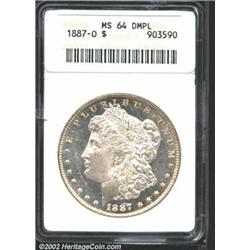 1887-O S$1 MS64 Deep Mirror Prooflike ANACS. Light olive-gold patina with an occasional hint of crimson color. The mirrored fields are bright and reflective. A very good strike with especially pleasing surfaces on the reverse. Important notice: We expect to be auctioning lots at the rate of 200-250 per hour. Sometimes eBay Premier live bid software cannot keep up with that pace, so we strongly recommend that you place a realistic proxy bid now as insurance to avoid disappointment. Also please note that all Heritage/CAA lots purchased through eBay Premier carry a 20% Buyer's Premium.