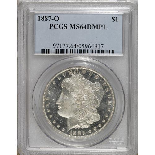 <B>1887-O S$1 MS64 Deep Mirror Prooflike PCGS.</B></I> Well struck with richly frosted devices and potent, practically untoned mirrors that reflect at arm's length. A pair of small brown spots appear on the obverse, one near 9 o'clock on the rim, the other near the hair at the temple.<BR><BR><b>Shipping:</b> Coins & Currency (<a target="_blank" href="http://www.heritageauctions.com/common/shipping.php">view shipping information</a>)