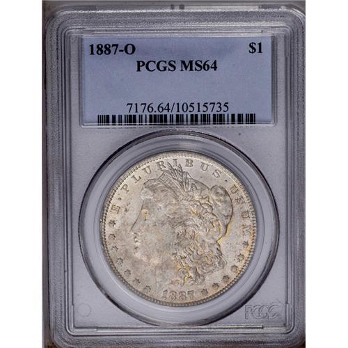 <B>1887-O<img border='0' src='http://www.heritagecoins.com/images/star.gif' width=10 height=10>$1> MS64 PCGS.</B></I> Choice and quite lustrous with orange, gold, and green patina over the obverse. This well struck example is minimally marked for the grade.