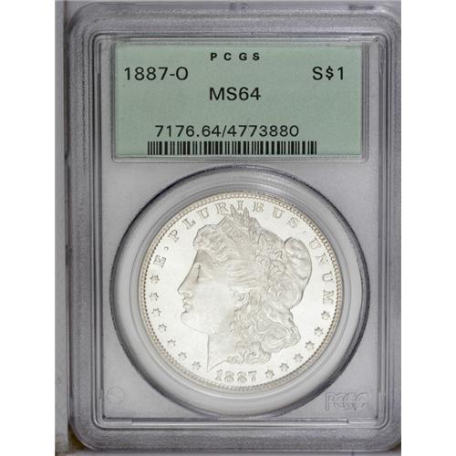 <B>1887-O<img border='0' src='http://www.heritagecoins.com/images/star.gif' width=10 height=10>$1> MS64 PCGS.</B></I> Light, unstruck roller marks show on the cheek and hair. The brilliant surfaces disclose few mentionable abrasions, and the overall eye appeal is high. Certified in a green label holder. <BR><BR><B>Important notice:</B> Heritage usually auctions material at the rate of 200-250 lots per hour. On some occasions eBay Live bid software or the Internet may not be able to keep up with the pace of the auction. We recommend placing a realistic absentee bid now as insurance to avoid disappointment. Occasionally the auctioneer may eliminate or reject an eBay Live bid, and the auctioneer may also reopen a lot after the close of the eBay live bidding (usually because we missed an audience bid), and may reject your bid even if it shows you as the winning bidder. By bidding via eBay Live, you agree that Heritage may award the lot to another bidder at its sole discretion under the circumstances described above or any other reasonable circumstances. Since eBay bids are not shown to us until we open the lot on the floor, we treat those bids just like floor bids. In most cases the floor responds before the eBay bid is presented to us, due to Internet lag time, so for consistency we have made it a policy that floor bids are always considered first over tie eBay live bids. Also please note that all Heritage lots purchased through eBay Live carry a 20% Buyer's Premium. Please make sure you read the Terms and Conditions before you bid. This lot is being auctioned in conjunction with a live floor auction by Heritage Galleries & Auctioneers. All final auction and invoice information will be supplied by Heritage Galleries & Auctioneers, and all other information should be considered preliminary. Lot:3474 <BR><BR><B>Winning Notification and Billing:</B> After the FINAL session in this auction is complete, Heritage will send e-mail and snail mail invoices. This process normally takes several days. All final auction and invoice information will be supplied by Heritage Galleries & Auctioneers, and all other information should be considered preliminary. <BR><BR>This auction will be conducted on a live auction floor and over the Internet through eBay Live. If you choose to place an absentee bid, please take a moment to <font color='#0000ff'><u><a href='http://pages.ebay.com/liveauctions/help/before/laabsentee.html'>learn how eBay Live absentee bidding works</a></u></font><font color='#000000'>