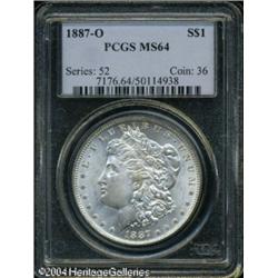 1887-O S$1 MS64 PCGS. Slightly soft over the ear, <B>1887-O S$1 MS64 PCGS.</B></I> Slightly soft over the ear, but boldly detailed on the remaining features, with a satiny, untoned, lightly marked appearance overall. Impressive for the grade, and with only a hint of tan color on the obverse. <BR><BR><B>Important notice:</B> Heritage usually auctions material at the rate of 200-250 lots per hour. On some occasions eBay Live bid software or the Internet may not be able to keep up with the pace of the auction. We recommend placing a realistic absentee bid now as insurance to avoid disappointment. Occasionally the auctioneer may eliminate or reject an eBay Live bid, and the auctioneer may also reopen a lot after the close of the eBay live bidding (usually because we missed an audience bid), and may reject your bid even if it shows you as the winning bidder. By bidding via eBay Live, you agree that Heritage may award the lot to another bidder at its sole discretion under the circumstances described above or any other reasonable circumstances. Since eBay bids are not shown to us until we open the lot on the floor, we treat those bids just like floor bids. In most cases the floor responds before the eBay bid is presented to us, due to Internet lag time, so for consistency we have made it a policy that floor bids are always considered first over tie eBay live bids. Also please note that all Heritage lots purchased through eBay Live carry a 20% Buyer's Premium. Please make sure you read the Terms and Conditions before you bid. This lot is being auctioned in conjunction with a live floor auction by Heritage Galleries & Auctioneers. All final auction and invoice information will be supplied by Heritage Galleries & Auctioneers, and all other information should be considered preliminary. Lot:7537