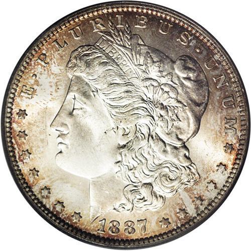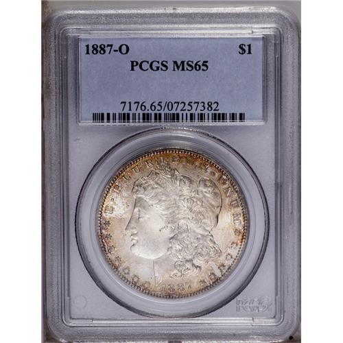 <B>1887-O<img border='0' src='http://www.heritagecoins.com/images/star.gif' width=10 height=10>$1> MS65 PCGS.</B></I> The 1887-O is a surprisingly scarce dollar, considering that more than 11 million pieces were struck. The typical Mint State example is extensively abraded, shows poor luster, and is weakly struck. As a result, Gems are seldom encountered. This is a remarkably lustrous and vibrant coin that has rich, sparkling satiny surfaces. While the striking details do not show complete highpoint definition, the devices are much better defined than usually seen. Most of each side is brilliant, but there is a considerable outline of golden-rose coloration around the obverse rim. There are also no mentionable abrasions on either side of this impressive Gem. <BR><BR><B>Important notice:</B> Heritage usually auctions material at the rate of 200-250 lots per hour. On some occasions eBay Live bid software or the Internet may not be able to keep up with the pace of the auction. We recommend placing a realistic absentee bid now as insurance to avoid disappointment. Occasionally the auctioneer may eliminate or reject an eBay Live bid, and the auctioneer may also reopen a lot after the close of the eBay live bidding (usually because we missed an audience bid), and may reject your bid even if it shows you as the winning bidder. By bidding via eBay Live, you agree that Heritage may award the lot to another bidder at its sole discretion under the circumstances described above or any other reasonable circumstances. Since eBay bids are not shown to us until we open the lot on the floor, we treat those bids just like floor bids. In most cases the floor responds before the eBay bid is presented to us, due to Internet lag time, so for consistency we have made it a policy that floor bids are always considered first over tie eBay live bids. Also please note that all Heritage lots purchased through eBay Live carry a 20% Buyer's Premium. Please make sure you read the Terms and Conditions before you bid. This lot is being auctioned in conjunction with a live floor auction by Heritage Galleries & Auctioneers. All final auction and invoice information will be supplied by Heritage Galleries & Auctioneers, and all other information should be considered preliminary. Lot:3475 <BR><BR><B>Winning Notification and Billing:</B> After the FINAL session in this auction is complete, Heritage will send e-mail and snail mail invoices. This process normally takes several days. All final auction and invoice information will be supplied by Heritage Galleries & Auctioneers, and all other information should be considered preliminary. <BR><BR>This auction will be conducted on a live auction floor and over the Internet through eBay Live. If you choose to place an absentee bid, please take a moment to <font color='#0000ff'><u><a href='http://pages.ebay.com/liveauctions/help/before/laabsentee.html'>learn how eBay Live absentee bidding works</a></u></font><font color='#000000'>