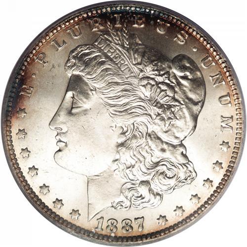 <B>1887-O<img border='0' src='http://www.heritagecoins.com/images/star.gif' width=10 height=10>$1> MS65 PCGS.</B></I> The silver centers blend into amber rims, with a small area of electric blue on the obverse, with similar reverse colors. Beyond the lovely surfaces, however, the strike is what <I>really</B></I> sets this specimen far apart from many other also-rans: the hair over the ear is sculpted--a rarity in itself for this issue--and the eagle's breast feathers are rounded and unruffled. The leaves in the wreath are all well detailed. Liberty's cheek is essentially pristine, although a tick is noted above her eyebrow. An extremely high-end and appealing coin. PCGS has graded only seven examples finer (3/06). <BR><BR><B>Important notice:</B> Heritage usually auctions material at the rate of 200-250 lots per hour. On some occasions eBay Live bid software or the Internet may not be able to keep up with the pace of the auction. We recommend placing a realistic absentee bid now as insurance to avoid disappointment. Occasionally the auctioneer may eliminate or reject an eBay Live bid, and the auctioneer may also reopen a lot after the close of the eBay live bidding (usually because we missed an audience bid), and may reject your bid even if it shows you as the winning bidder. By bidding via eBay Live, you agree that Heritage may award the lot to another bidder at its sole discretion under the circumstances described above or any other reasonable circumstances. Since eBay bids are not shown to us until we open the lot on the floor, we treat those bids just like floor bids. In most cases the floor responds before the eBay bid is presented to us, due to Internet lag time, so for consistency we have made it a policy that floor bids are always considered first over tie eBay live bids. Also please note that all Heritage lots purchased through eBay Live carry a 20% Buyer's Premium. Please make sure you read the Terms and Conditions before you bid. This lot is being auctioned in conjunction with a live floor auction by Heritage Galleries & Auctioneers. All final auction and invoice information will be supplied by Heritage Galleries & Auctioneers, and all other information should be considered preliminary. Lot:3476 <BR><BR><B>Winning Notification and Billing:</B> After the FINAL session in this auction is complete, Heritage will send e-mail and snail mail invoices. This process normally takes several days. All final auction and invoice information will be supplied by Heritage Galleries & Auctioneers, and all other information should be considered preliminary. <BR><BR>This auction will be conducted on a live auction floor and over the Internet through eBay Live. If you choose to place an absentee bid, please take a moment to <font color='#0000ff'><u><a href='http://pages.ebay.com/liveauctions/help/before/laabsentee.html'>learn how eBay Live absentee bidding works</a></u></font><font color='#000000'>