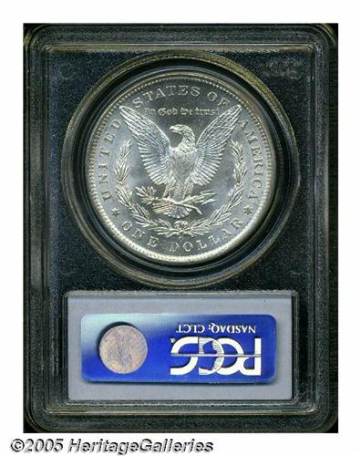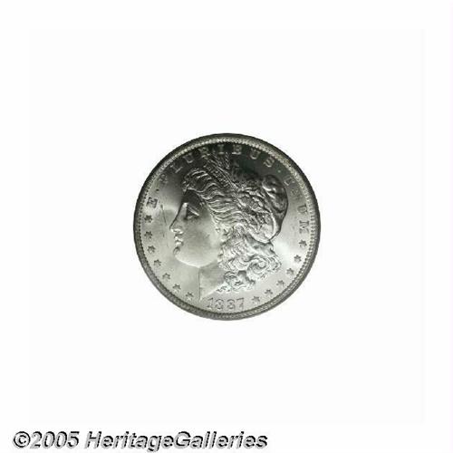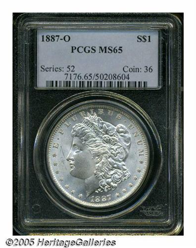 <B>1887-O<S$1> MS65 PCGS.</B></I> The typical Mint State 1887-O Dollar exhibits muted luster, a soft strike in the central areas, and often, a heavily bagmarked appearance, thus limiting the grade to MS64 or lower. It is a privilege to offer this MS65 example in the present sale. This piece exhibits swirling, snow-white luster and a bold strike with superior definition on the hair over Liberty's ear and on the eagle's breast feathers. The surfaces are well preserved, revealing just a couple of minute marks on Liberty's face and on the eagle's right wing. PCGS has certified a mere seven coins finer, and NGC has seen three grading higher (6/05).