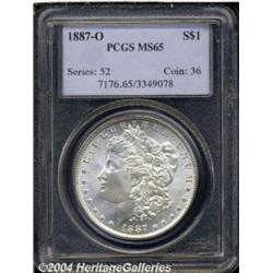 <B>1887-O<S$1> MS65 PCGS.</B></I> While generally obtainable in lower Mint State grades (particularly when softly defined in the centers), the 1887-O is a condition rarity of note as a sharply struck Gem. This appealing representative displays mostly smooth surfaces that are free of all but a few well scattered bagmarks. The full luster is unusually vibrant for the issue, and the overall sharp strike is worthy of praise. Untoned, or essentially so, with solid eye appeal. <BR><BR><B>Important notice:</B> Heritage usually auctions material at the rate of 200-250 lots per hour. On some occasions eBay Live bid software or the Internet may not be able to keep up with the pace of the auction. We recommend placing a realistic absentee bid now as insurance to avoid disappointment. Occasionally the auctioneer may eliminate or reject an eBay Live bid, and the auctioneer may also reopen a lot after the close of the eBay live bidding (usually because we missed an audience bid), and may reject your bid even if it shows you as the winning bidder. By bidding via eBay Live, you agree that Heritage may award the lot to another bidder at its sole discretion under the circumstances described above or any other reasonable circumstances. Since eBay bids are not shown to us until we open the lot on the floor, we treat those bids just like floor bids. In most cases the floor responds before the eBay bid is presented to us, due to Internet lag time, so for consistency we have made it a policy that floor bids are always considered first over tie eBay live bids. Also please note that all Heritage lots purchased through eBay Live carry a 20% Buyer's Premium. Please make sure you read the Terms and Conditions before you bid. </span></font></tr></table></td></tr></table>