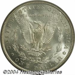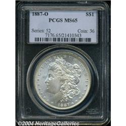 <B>1887-O<S$1> MS65 PCGS.</B></I> This is an attractive Gem with frosty silver luster and pale champagne toning. Although not fully struck, this is much sharper than usually seen. While considered a common date in circulated and lower mint state grades, few Gem quality survivors exist from the mintage of 11,550,000 coins. Most mint state examples known today come from the 1962 to 1964 Treasury release, as well as a few bags distributed prior to this time. Population: 175 in 65, 6 finer (7/04). <BR><BR><B>Important notice:</B> Heritage usually auctions material at the rate of 200-250 lots per hour. On some occasions eBay Live bid software or the Internet may not be able to keep up with the pace of the auction. We recommend placing a realistic absentee bid now as insurance to avoid disappointment. Occasionally the auctioneer may eliminate or reject an eBay Live bid, and the auctioneer may also reopen a lot after the close of the eBay live bidding (usually because we missed an audience bid), and may reject your bid even if it shows you as the winning bidder. By bidding via eBay Live, you agree that Heritage may award the lot to another bidder at its sole discretion under the circumstances described above or any other reasonable circumstances. Since eBay bids are not shown to us until we open the lot on the floor, we treat those bids just like floor bids. In most cases the floor responds before the eBay bid is presented to us, due to Internet lag time, so for consistency we have made it a policy that floor bids are always considered first over tie eBay live bids. Also please note that all Heritage lots purchased through eBay Live carry a 20% Buyer's Premium. Please make sure you read the Terms and Conditions before you bid. </span></font></tr></table></td></tr></table>
