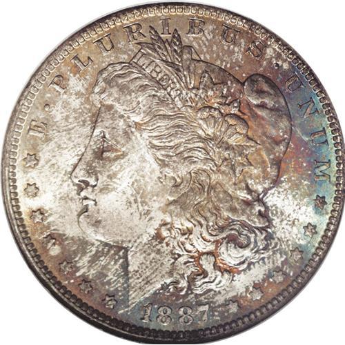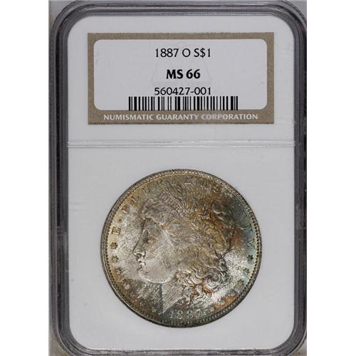 <B>1887-O<img border='0' src='http://www.heritagecoins.com/images/star.gif' width=10 height=10>$1> MS66 NGC.</B></I> A pleasing and original example of this conditionally rare O-mint issue, this coin is also one of the 10 finest '87-O dollars known to the two major grading services. The striking quality on both sides is above-average for the date, and the luster is uncommonly vibrant for this often lackluster issue. We can find no distracting bagmarks on either side, and the obverse is overlaid with mottled dove-gray, sunset-red, gold, and sea-green color. The reverse is essentially brilliant. Census: 3 in 66, 0 finer (7/06).