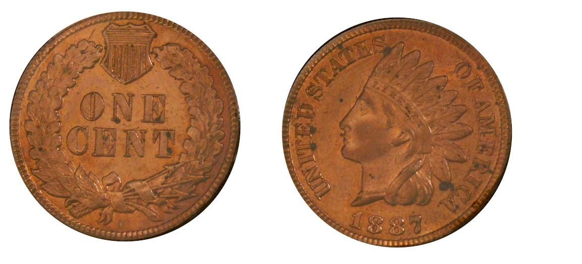 1887-P 1¢. BU example 95% red with light spots. Should be viewed.