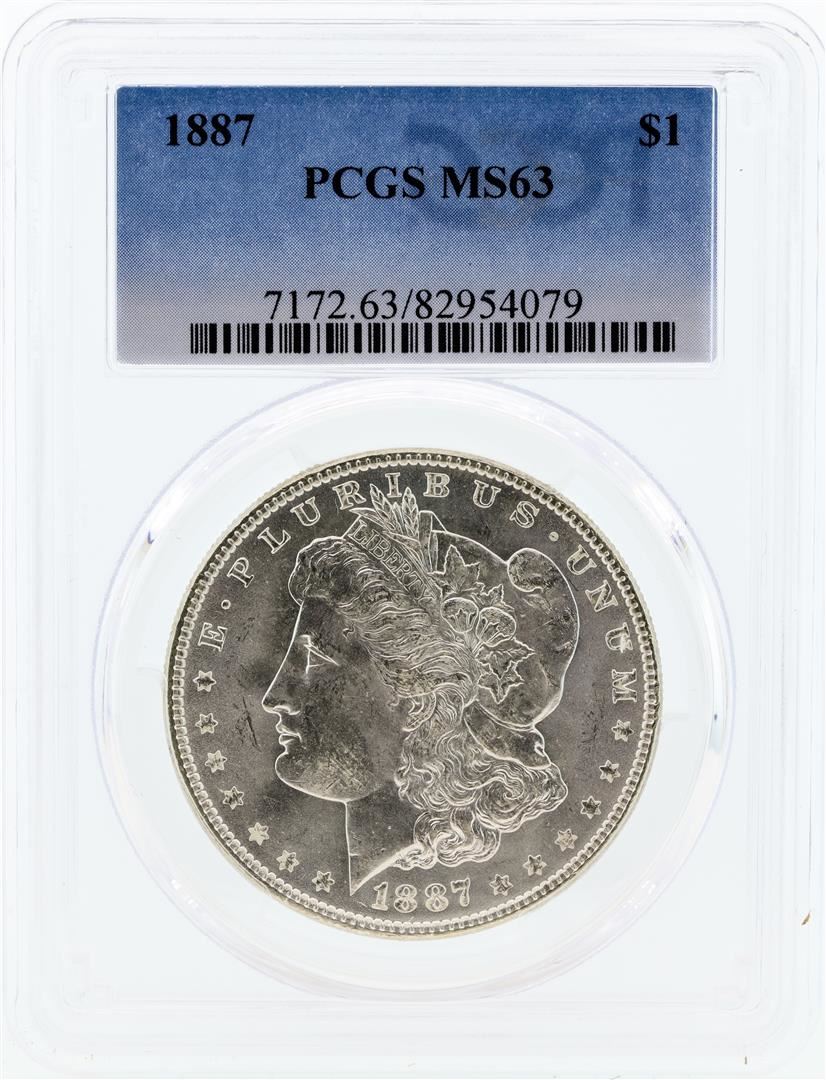 One 1887 PCGS MS63 Morgan Silver Dollar.