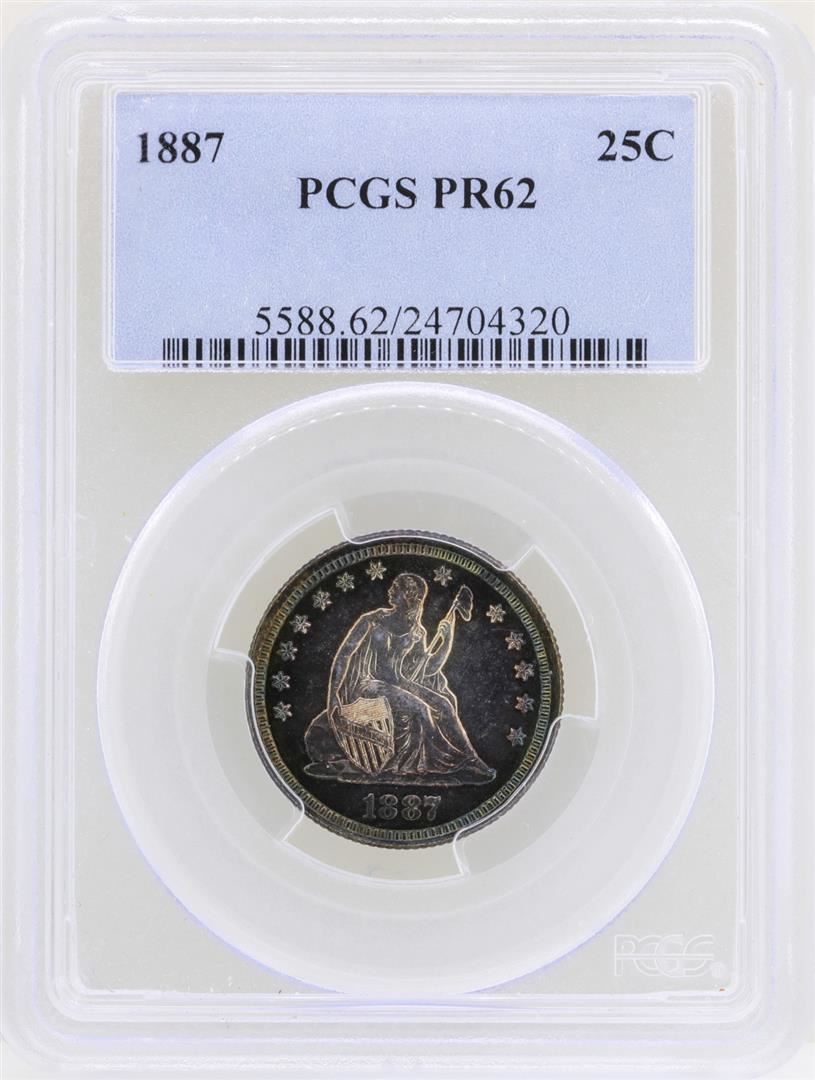 One 1887 Proof Seated Liberty Quarter Coin PCGS PR62 Amazing Toning. PCGS Graded.