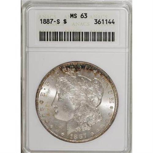 <B>1887-S $1 MS63 ANACS.</B></I> . NGC Census: (1266/963). PCGS Population (2083/1828). Mintage: 1,771,000. Numismedia Wsl. Price for NGC/PCGS coin in MS63: $220. (#7180)<BR><BR><B>Coin Engraver:</B> George T. Morgan<BR><BR><b>Shipping:</b> Coins & Currency (<a target="_blank" href="http://www.heritageauctions.com/common/shipping.php">view shipping information</a>)