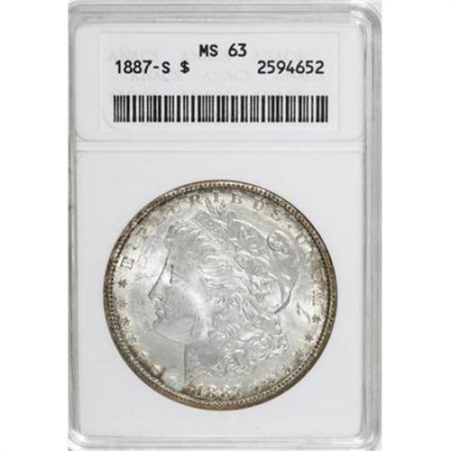 <B>1887-S $1 MS63 ANACS.</B></I> . NGC Census: (1266/963). PCGS Population (2083/1828). Mintage: 1,771,000. Numismedia Wsl. Price for NGC/PCGS coin in MS63: $220. (#7180)<BR><BR><B>Coin Engraver:</B> George T. Morgan<BR><BR><b>Shipping:</b> Coins & Currency (<a target="_blank" href="http://www.heritageauctions.com/common/shipping.php">view shipping information</a>)