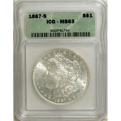 <B>1887-S $1 MS63 ICG.</B></I> NGC Census: (1273/966). PCGS Population (2112/1861). Mintage: 1,771,000. Numismedia Wsl. Price for NGC/PCGS coin in MS63: $220. (#7180)<BR><BR><B>Coin Engraver:</B> George T. Morgan<BR><BR><b>Shipping:</b> Coins & Currency (<a target="_blank" href="http://www.heritageauctions.com/common/shipping.php">view shipping information</a>)