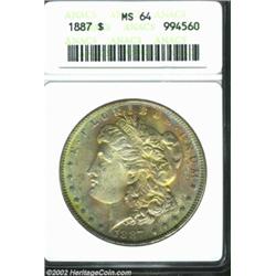 1887 S$1 MS64 ANACS. The peak of the 7 in the date is repunched. The obverse has lovely gold, orange