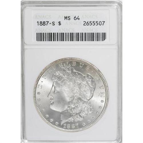 <B>1887-S $1 MS64 ANACS.</B></I> NGC Census: (788/139). PCGS Population (1310/263). Mintage: 1,771,000. Numismedia Wsl. Price for NGC/PCGS coin in MS64: $570. (#7180)<BR><BR><B>Coin Engraver:</B> George T. Morgan<BR><BR><b>Shipping:</b> Coins & Currency (<a target="_blank" href="http://www.heritageauctions.com/common/shipping.php">view shipping information</a>\)