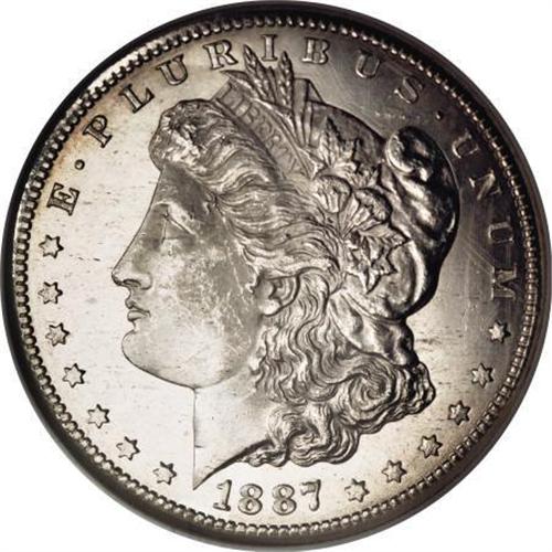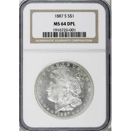 <B>1887-S $1 MS64 Deep Mirror Prooflike NGC.</B></I> Bowers, in his book <I>Silver Dollars and Trade Dollars of the United States,</B></I> writes that 1887-S prooflike dollars are usually one-sided, obverse only. He also notes that MS64 DMPL coins are rare, and higher grades are extremely rare. The near-Gem example presently offered features gorgeous, deep mirrors over each side that provide a strong contrast with the motifs. The surfaces are well preserved, with just a few minor luster grazes apparent on Liberty's cheek. Boldly struck and untoned save for occasional whispers of cloud-white over the fields.<BR><BR><b>Shipping:</b> Coins & Currency (<a target="_blank" href="http://www.heritageauctions.com/common/shipping.php">view shipping information</a>)