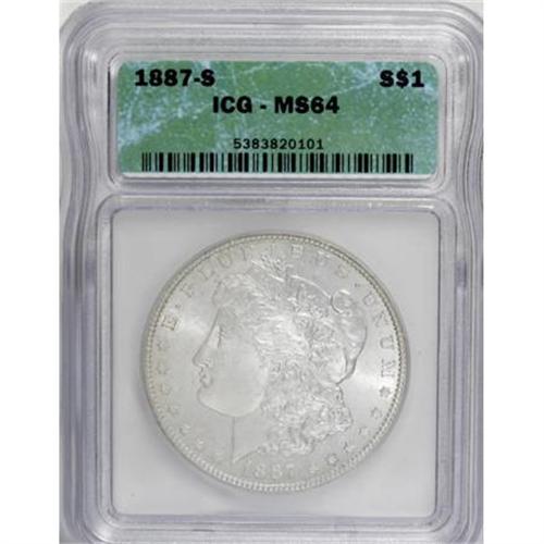 <B>1887-S $1 MS64 ICG.</B></I> . NGC Census: (816/147). PCGS Population (1489/339). Mintage: 1,771,000. Numismedia Wsl. Price for NGC/PCGS coin in MS64: $550. (#7180)<BR><BR><B>Coin Engraver:</B> George T. Morgan<BR><BR><b>Shipping:</b> Coins & Currency (<a target="_blank" href="http://www.heritageauctions.com/common/shipping.php">view shipping information</a>)