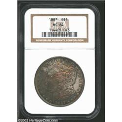 1887 S$1 MS64 NGC. Competing swaths of slate-gray and olive toning yield to even more irregular rain