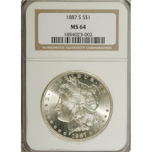 <B>1887-S $1 MS64 NGC.</B></I> NGC Census: (736/125). PCGS Population (1321/273). Mintage: 1,771,000. Numismedia Wsl. Price: $560. (#7180)<BR><BR><b>Shipping:</b> Coins & Currency (<a target="_blank" href="http://www.heritageauctions.com/common/shipping.php">view shipping information</a>)