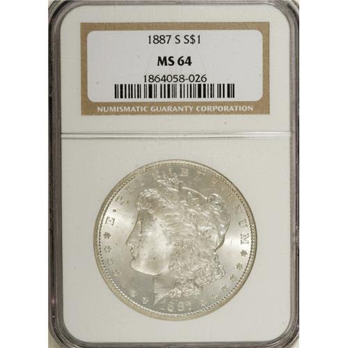 <B>1887-S $1 MS64 NGC.</B></I> NGC Census: (736/125). PCGS Population (1321/273). Mintage: 1,771,000. Numismedia Wsl. Price: $560. (#7180)<BR><BR><b>Shipping:</b> Coins & Currency (<a target="_blank" href="http://www.heritageauctions.com/common/shipping.php">view shipping information</a>)
