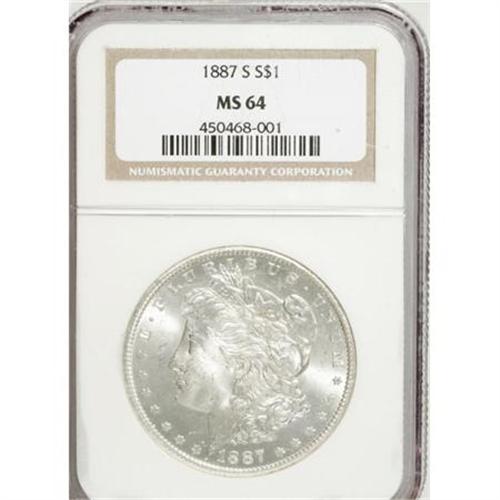 <B>1887-S $1 MS64 NGC.</B></I> NGC Census: (800/145). PCGS Population (1442/325). Mintage: 1,771,000. Numismedia Wsl. Price for NGC/PCGS coin in MS64: $570. (#7180)<BR><BR><B>Coin Engraver:</B> George T. Morgan<BR><BR><b>Shipping:</b> Coins & Currency (<a target="_blank" href="http://www.heritageauctions.com/common/shipping.php">view shipping information</a>)