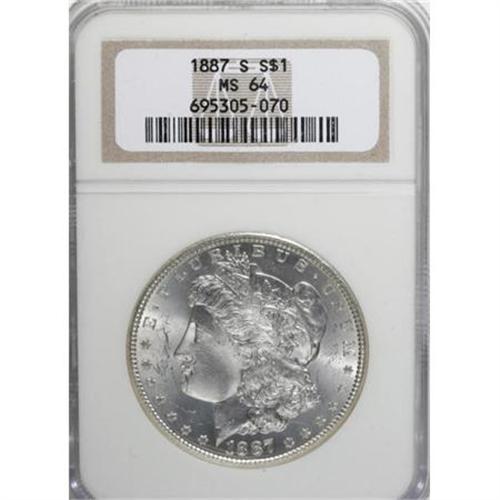 <B>1887-S $1 MS64 NGC.</B></I> NGC Census: (816/147). PCGS Population (1503/344). Mintage: 1,771,000. Numismedia Wsl. Price for NGC/PCGS coin in MS64: $550. (#7180)<BR><BR><B>Coin Engraver:</B> George T. Morgan<BR><BR><b>Shipping:</b> Coins & Currency (<a target="_blank" href="http://www.heritageauctions.com/common/shipping.php">view shipping information</a>)