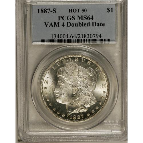 <B>1887-S $1 MS64 PCGS.</B></I> VAM-4. A Hot 50 Variety. The date is repunched, most noticeably southwest of the 1 and 7. The 1887-S is a better date regardless of VAM variety. This example has flashy fields and dazzling luster. The strike is decent, and minor marks are insufficient to challenge the grade.<BR><BR><b>Shipping:</b> Coin/Currency (<a target="_blank" href="http://www.heritageauctions.com/common/shipping.php">view shipping information</a>)