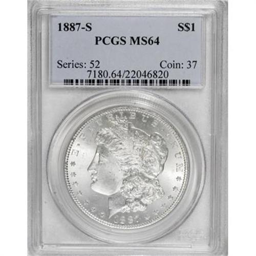 <B>1887-S $1 MS64 PCGS.</B></I> PCGS Population (1410/311). NGC Census: (800/145). Mintage: 1,771,000. Numismedia Wsl. Price for NGC/PCGS coin in MS64: $570. (#7180)<BR><BR><B>Coin Engraver:</B> George T. Morgan<BR><BR><b>Shipping:</b> Coins & Currency (<a target="_blank" href="http://www.heritageauctions.com/common/shipping.php">view shipping information</a>)