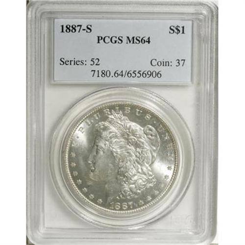 <B>1887-S $1 MS64 PCGS.</B></I> PCGS Population (1439/325). NGC Census: (800/145). Mintage: 1,771,000. Numismedia Wsl. Price for NGC/PCGS coin in MS64: $570. (#7180)<BR><BR><B>Coin Engraver:</B> George T. Morgan<BR><BR><b>Shipping:</b> Coins & Currency (<a target="_blank" href="http://www.heritageauctions.com/common/shipping.php">view shipping information</a>)