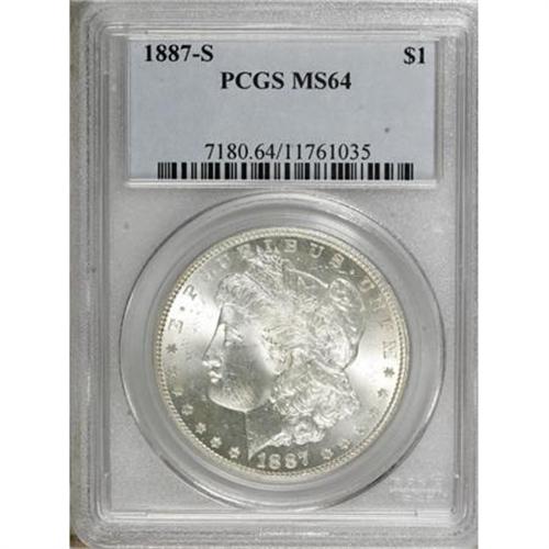 <B>1887-S $1 MS64 PCGS.</B></I> . PCGS Population (1489/339). NGC Census: (817/147). Mintage: 1,771,000. Numismedia Wsl. Price for NGC/PCGS coin in MS64: $550. (#7180)<BR><BR><B>Coin Engraver:</B> George T. Morgan<BR><BR><b>Shipping:</b> Coins & Currency (<a target="_blank" href="http://www.heritageauctions.com/common/shipping.php">view shipping information</a>)